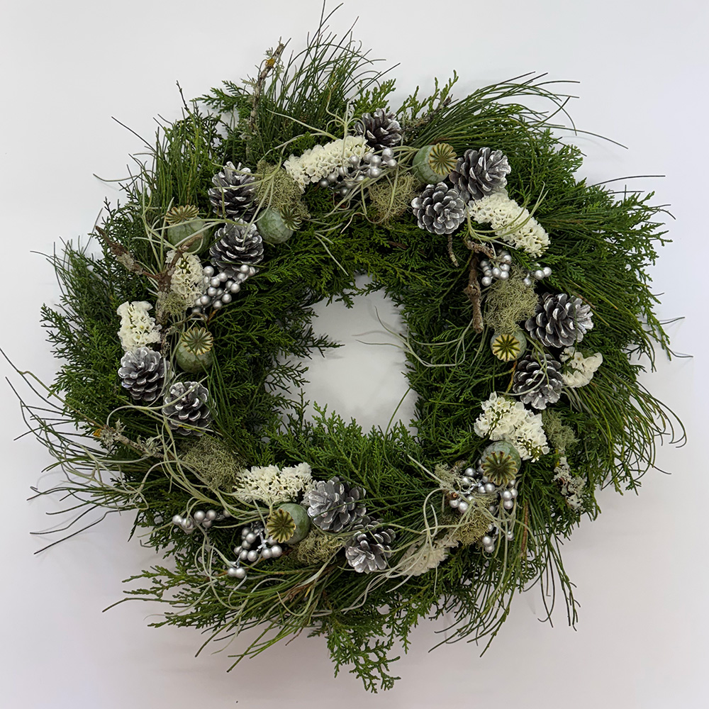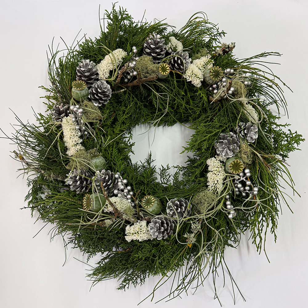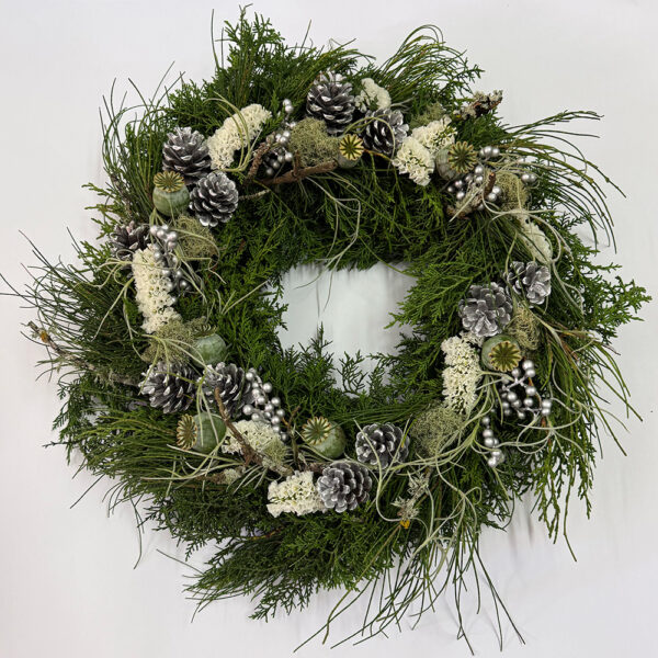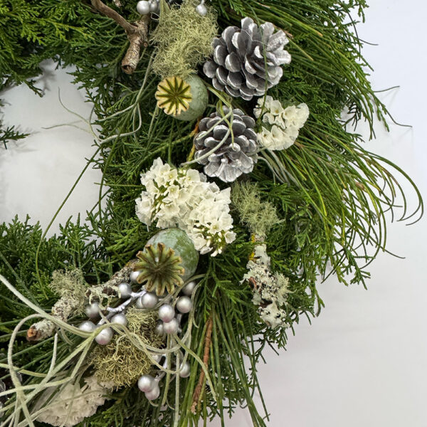Inspired by snow laden landscapes designed with featherlike white statice and featuring silver accents this is one of our more popular Christmas Wreaths.