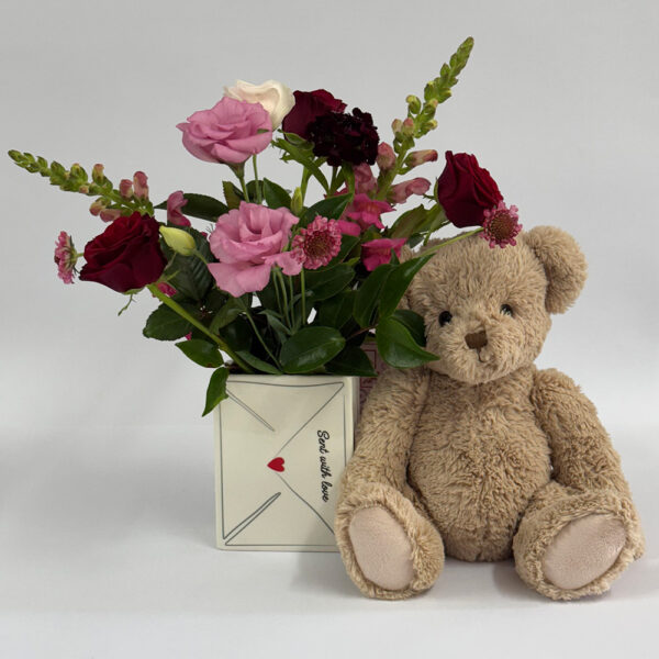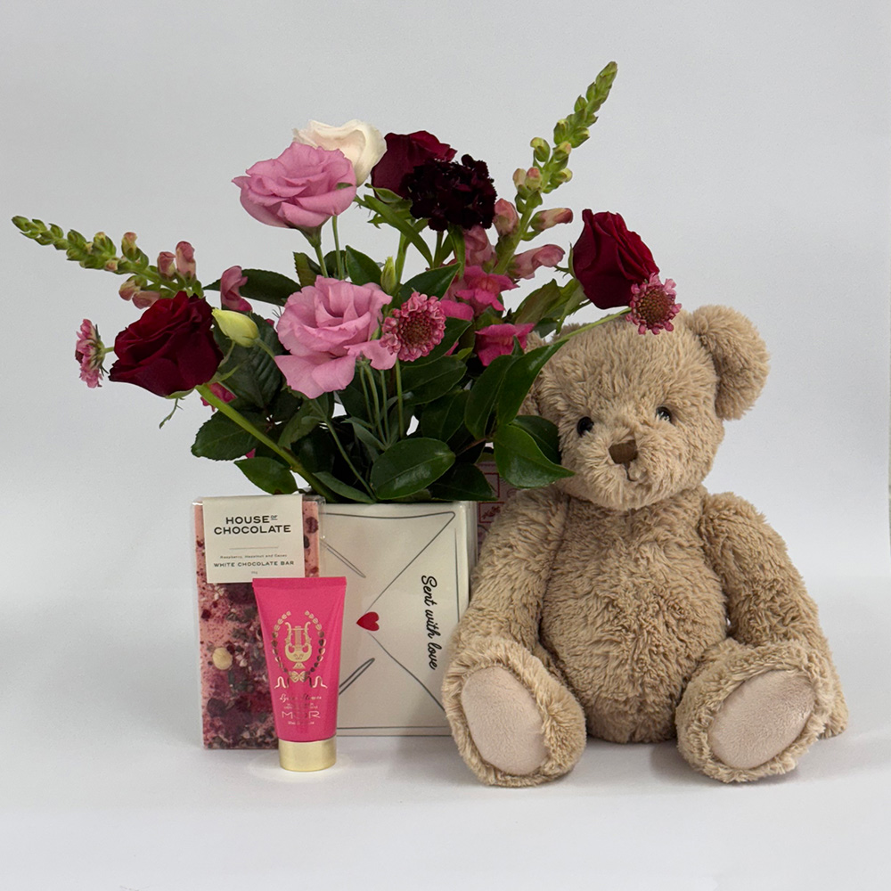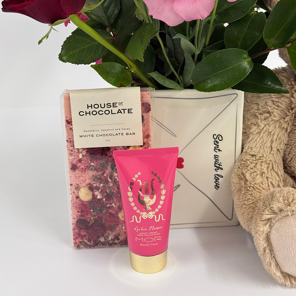 A gift from the heart: a delicate bouquet of pink and red blooms, gently nestled in a keepsake Love Letters ceramic vase—a little treasure that whispers romance. Present the vase and flowers on their own, or pair them with exquisite extras to create a truly magical gift, brimming with love and enchantment.