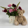 Deluxe size gift bag includes the flowers, vase, chocolate, hand cream and a very very cuddly bear