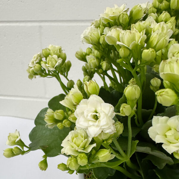 Easy to care for, the popular Kalanchoe will is a must have in your home or office. Adorned with clusters of long lasting white flowers all nestled above thick shiny green leaves, and presented in a stylish white ceramic pot. The perfect long lasting potted gift.
