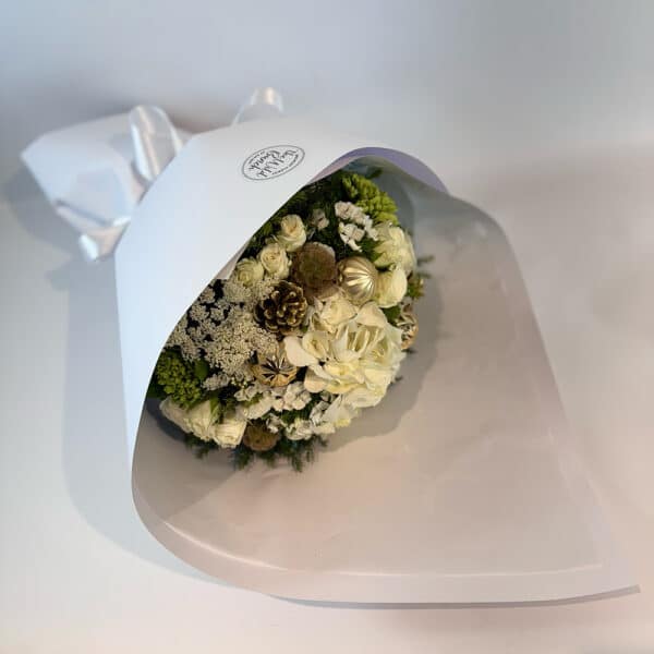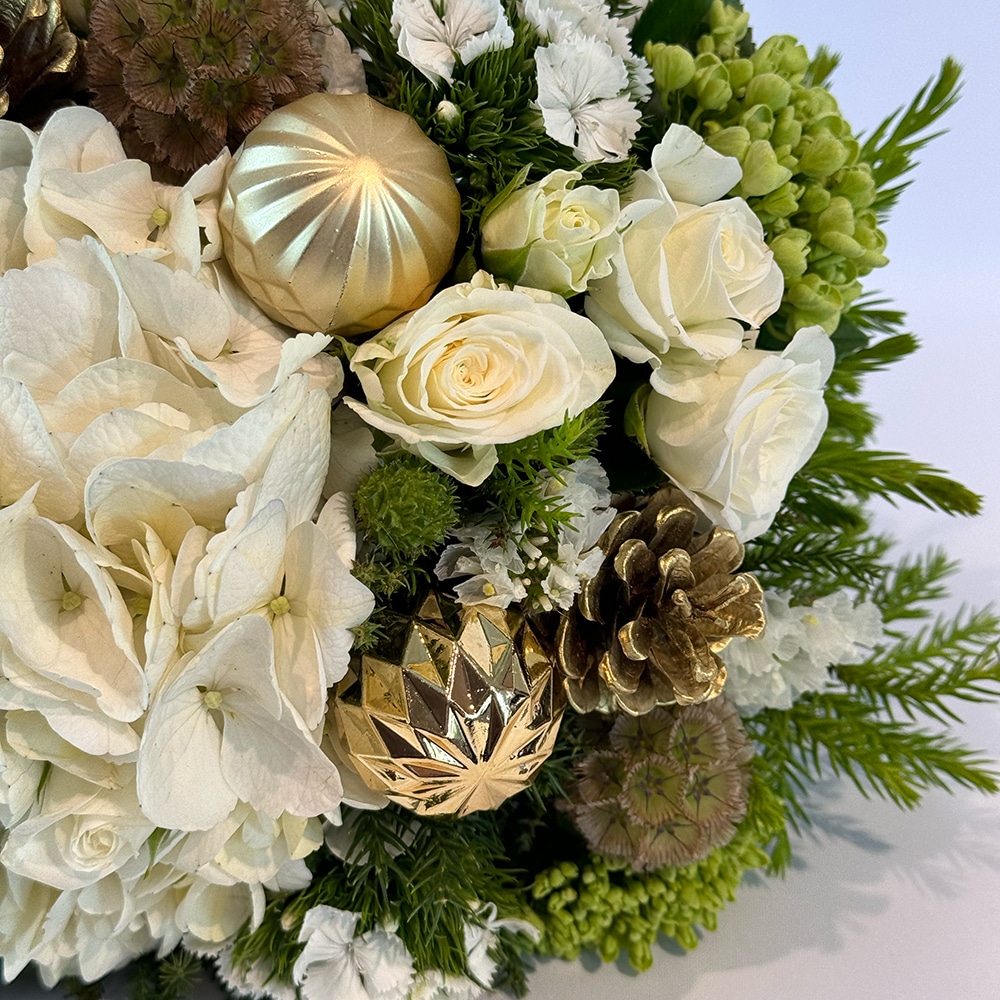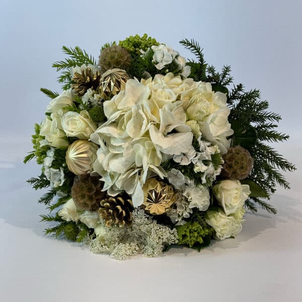 An exquisite Christmas posy in whites and golds featuring Gold Christmas baubles and pine cones, a gorgeous posy to celebrate the season of giving.